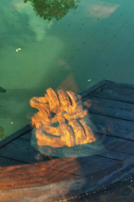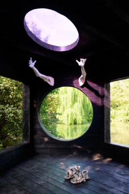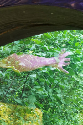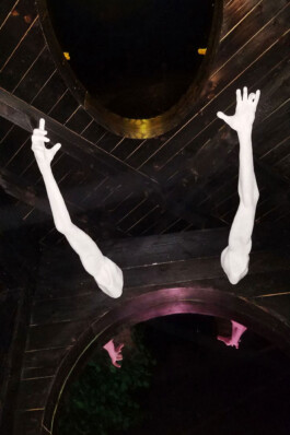 In the pavilion “Mother Of Pearl” there are three works on display. Two widespread arms, installed above a round window, a silver vitrine placed in the opening and a pair of Track Sandals on the floor. “Forever Active” is written on the belts of the sandals and the words are facing towards the viewer.
